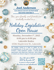 You, your family, and your friends are cordially invited to a Holiday Legislative Open House which includes a 2025 legislative update, a special photo opportunity with Supervisor Anderson, and a chance to submit your ideas to improve County government. The holiday season is a time to reflect on the accomplishments of the past year!